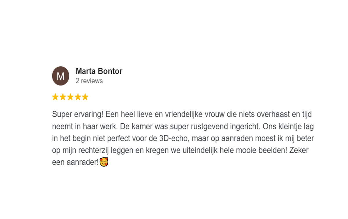 Wij doen steeds onze uiterste best om elke echo tot een onvergetelijke ervaring te maken. Lees hieronder de verhalen van ouders die deze unieke momenten met ons hebben gedeeld. Hun ervaringen vertellen ons verhaal, een verhaal van vreugde, verbondenheid en bijzondere eerste ontmoetingen.